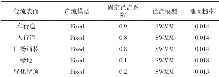汇水范围内下垫面包括车行道、人行道、广场铺装、绿地、绿化屋顶,各径流表面类型及其参数的设置见下表: