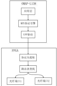 FPGA 实现了 OMAP-L138 UPP 通信的对端核心部分,实现协议解析 - 路由决策- 数据转发的全流程硬加速过程。采用了三级流水:(1) 协议处理层:利用状态机解析上行帧头得到 {Module ID, Port ID, Socket ID } 参数,并且将下行的数据进行目标标识 ( 需要封装的目标标识包含 CRC-32 校验 ) ;(2) 智能路由层:本层由1024 项可配置 LUT(look up table) 组成,完成不同层号到物理端口地址的映射,具有可静态固化、可OMAP 远程配置。