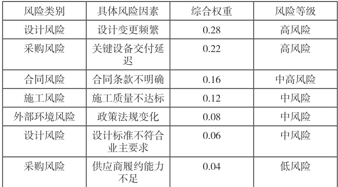 采用组合权重法进行风险排序,具体步骤如下:通过AHP 层次分析法确定主观权重(Wi);基于历史项目数据计算客观权重(Wj);采用组合赋权公式计算综合权重: W=αWi+(1-α)Wj (取 α=0.6 )。