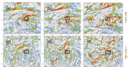图 1 散度场分布图(其中 (a)(b)(c) 分别为 4 月 11 日 14 时、17 时、20 时(北京时)的 200hpa 高度上的散度分布图;(d)(e)(f) 分别为 4 月 11 日 14 时、17 时、20 时(北京时)的 850hpa 高度上的散度分布图;黑色方框的中心点为武汉机场)