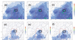图4 大气柱可降水量分布图、700hpa 水汽通量分布图(其中(a)(b)(c) 分别为4 月11 日14 时、17 时、20 时(北京时)的大气柱可降水量分布图;(d)(e)(f) 分别为4 月11 日14 时、17 时、20 时(北京时)的700hpa 水汽通量分布图;黑色方框的中心点为武汉机场)