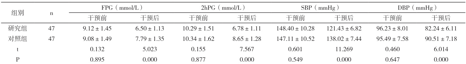(1)血糖及血压水平:分别在干预前及干预后,对比两组血糖、血压水平。血糖指标采用血糖仪检测空腹血糖(FPG)及餐后 2h 血糖 (2hPG),血压采用水银血压计测量收缩压(SBP)和舒张压(DBP)。