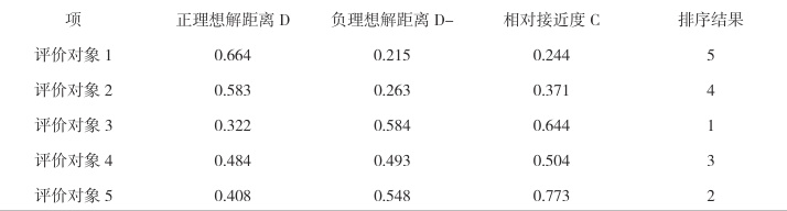 通过以上数据可得,即使其他维度均不变得前提下,企业总耗能C2(tce)、万顿产值综合能耗D1( (kgce/t) 、二氧化硫排放 D2(吨)、氮氧化物排放 D3(吨)、颗粒物排放量 D4( 吨)、生产废物回收利用率 D5 均会有明显改变。根据TOPSIS 方法计算得到的综合评分如下: