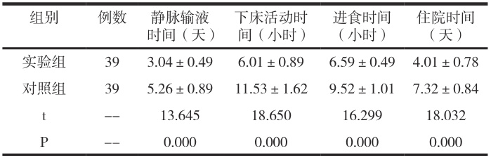 实验组术后康复时间指标比对照组短, P<0.05 。