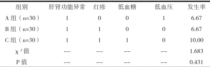 2.3 比较三组不良反应发生率C 组不良反应发生率与B 组、A 组比,差异无统计学意义(P>0.05)。见表 3。表3 :不良反应发生率对比[n(%)]