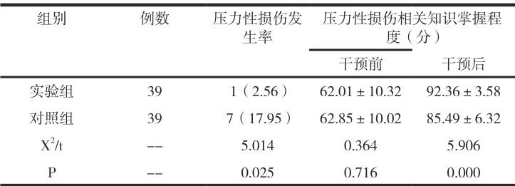 实验组压力性损伤发生率低于对照组,实验组相关知识掌握程度评分高于对照组, P<0.05AA 。