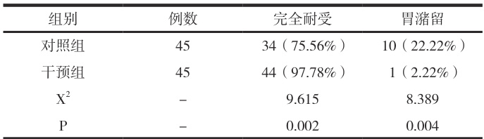 干预组喂养耐受性更优、胃潴留发生率低( P<0.05 ),详见表 1