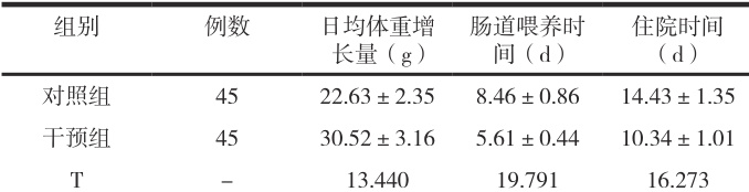 对比日均体重增长量、肠道喂养时间、住院时间等相关指标。