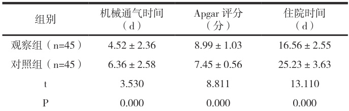 两组患儿临床相关指标情况。主要观察机械通气时间、Apgar 评分及住院时间。Apgar 评分总分 0-10 分, <4 分视为“重度窒息”,7 分视为“轻度窒息”,8-10 分视为“正常新生儿”。