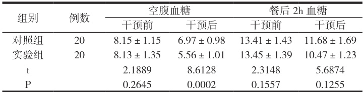将患者的血糖水平进行对比,实验组低于对照组。两组间存在差异,具有统计学意义( P<0.05 )具体情况见表 1.