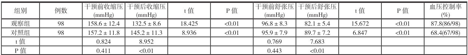 选择社区高血压患者 196 例,随机分为观察组和对照组各 98 例。纳入标准:年龄 18~75 岁,原发性高血压,病程 ⩾6 个月。排除标准:继发性高血压,合并严重疾病,妊娠期女性,精神疾病。观察组年龄 (58.3±9.2) 岁,对照组年龄 (59.1±8.7) 岁。两组基线资料比较,差异无统计学意义 (P>0.05) 。