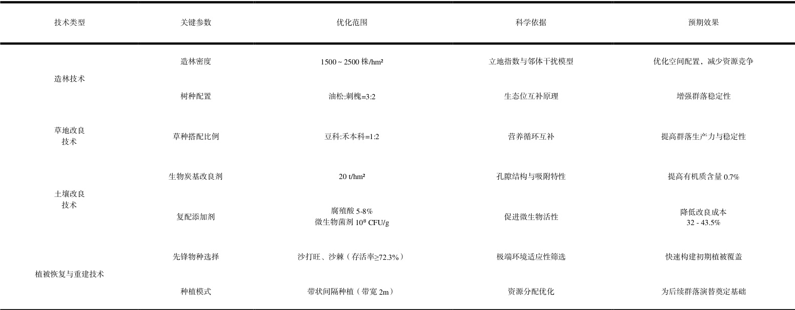 优化策略聚焦技术协同与区域适配性,造林技术依立地指数和邻体干扰模型调整密度,按生态位互补配置油松与刺槐,降低种间竞争强度 28%;草地改良技术采用豆科-禾本科混播,利用营养循环互补提升生产力,延长稳定性周期2 个生长季;土壤改良技术以生物炭为基质,复配腐殖酸与微生物菌剂,提升土壤有机质 0.7% ,降低改良成本 32%43.5% 。植被恢复与重建技术针对极端退化区,筛选耐旱先锋物种如沙打旺、沙棘,采用带状间隔种植构建初期覆盖,待土壤有机质提升至1.0%后引入乡土灌木与草本,形成阶梯式群落构建路径。