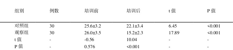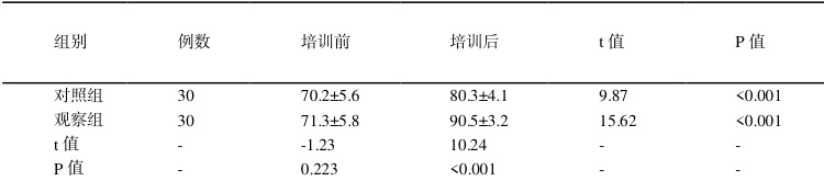 培训前,两组护理人员理论知识测试成绩差异无统计学意义 ΦP>0.05Φ) 培训后,观察组理论知识测试平均得分(90.5±3.2)分,显著高于对照组的(80.3±4.1)分,差异有统计学意义(P<0.05)。具体数据见表1。