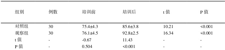 2.2 两组护理人员培训前后技能操作评分比较培训前,两组护理人员技能操作评分差异无统计学意义(