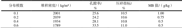 根据不同分布模数的机制砂各项性能指标可得,随着分布模数的增大,堆积密度和孔隙率出现先增加后降低的情况,连续级配下机制砂中的颗粒级配改善,孔隙率降低,当分布模数达到0.2时,堆积密度达到最大值,且该状态下孔隙率最小,当分布模数继续增大,粗颗粒增 Z ;MB值随着分布模数的增大而降低,分布模数增大,粗颗粒增多,总表面积下降,对亚甲蓝的吸附位点减少。
