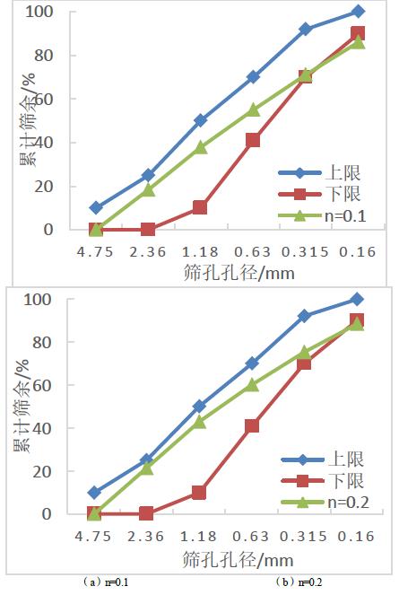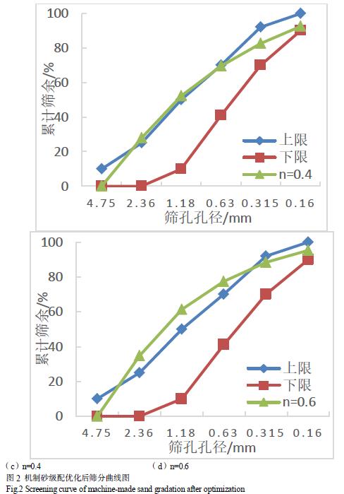 分别采用分布模数为0.1、0.2、0.4、0.6进行不同粒径的机制砂人工优化,优化后的机制砂累计筛余曲线如下图2所示。
