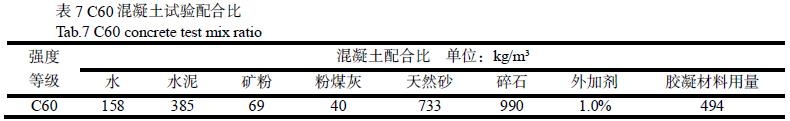 根据标准设计混凝土配合比,配合比如下表7所示,采用上述不同分布模数的机制砂进行混凝土试验,半采用未经人工调整的机制砂作为对照组,试验结果及探讨如下。
