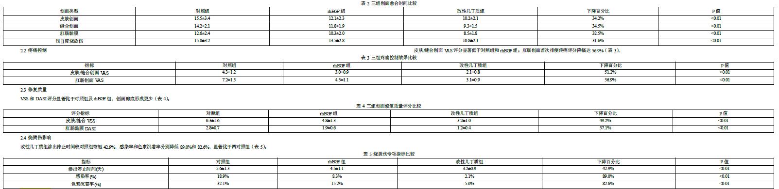 改性几丁质组在创面愈合时间均显著短于对照组和rhEGF组(均P<0.01),其中皮肤创面缩短34.2%,肛肠黏膜缩短32.5%(表2)。