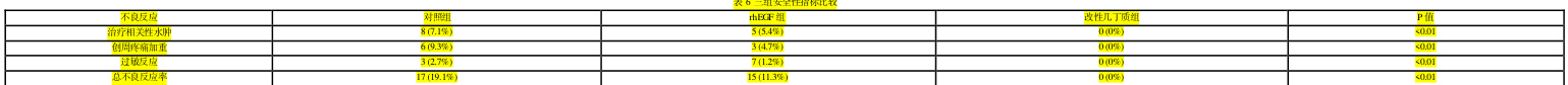 改性几丁质组未发生水肿、疼痛加重或过敏反应(表6),显著优于对照组。其中2例rhEGF 组患者因凝胶过敏改用生理盐水,而改性几丁质组创周皮肤红斑指数小于对照组。