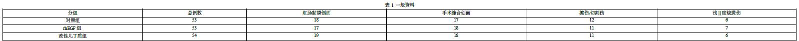 采用随机数表法将患者分为三组:对照组(n=53)、rhEGF组(n=53)和改性几丁质组(n=54)。干预措施:1)对照组:接受常规清创处理,并使用生理盐水进行创面冲洗和湿敷。2)rhEGF组:在常规清创处理的基础上,使用重组人表皮生长因子凝胶进行创面涂抹。3)改性几丁质组:在常规清创处理的基础上,使用(改性几丁质生物敷料(喷剂),注册证号:桂械注准20242140453)进行创面喷涂。具体使用方法为每日喷涂2-3次,每次喷涂量以覆盖创面为准,直至创面完全愈合。