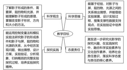 在学习之前,通过访谈和调查发现,学生对影子有一定的基础认知,但对影子的科学概念和准确描述仍是模糊的。基于学情和新课标要求,我立足培养学生的核心素养,制定以下教学目标:见图1
