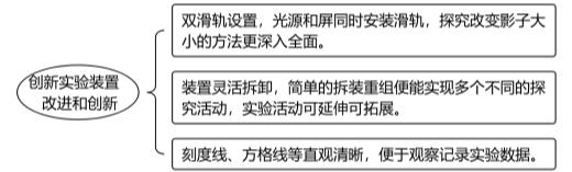 屏的部分,屏上设计网格线,方便记录实验数据和分析实验现象,屏下设计滑轨,通过滑轨移动屏,底板设计刻度线,方便观察记录屏与阻挡物的距离,可抽插的屏是为了方便更换版图来开展多种实验探究,比如探究影子的形成和变化,影子绘本的创编活动,以及后续课时的探究影子变化规律和模拟日晷实验等,实现实验装置一器多用,拓展多个课时实验,整合实验资源,增强实验教学深度。