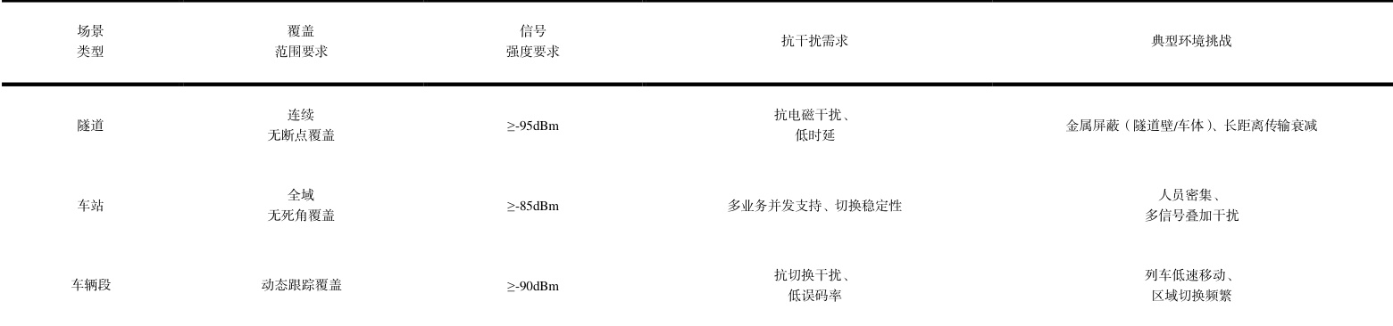地铁通信系统需在复杂物理环境与运营条件下实现高质量信号覆盖,其需求具有显著的场景差异化特征。基于隧道、车站、车辆段三类核心场景的环境特性与业务需求,可通过量化指标明确覆盖要求(见表 1)。
