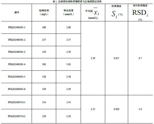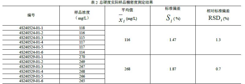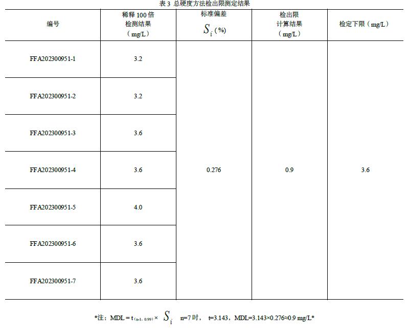 依据《环境监测分析方法标准制订技术导则》(HJ 168-2020)确定方法检出限。选用总硬度有证标准物质(坛墨质检科技股份有限公司,编号 FFA202400951,浓度 316 ± 31 mg/L,即 3.16 ± 0.31 mmol/L),取 10.0 mL 定容至 1000 mL(稀释 100 倍),得到浓度约 3.2 mg/L的样品。按样品分析全步骤平行测定7 次,具体结果见表3。