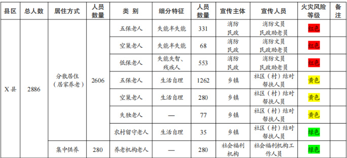(二)底数基本清晰。县民政部门前期组织各乡镇、园区民政办对辖区内独立生活老人进行了全面排查梳理,建立了独立生活老人群体的底数台账,为县消防救援部门探索消防安全分级宣传提供了数据支撑和分类依据。