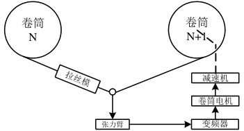 拔丝机电控系统主要由 PLC、底层卷筒变频器以及上位机触摸屏等组成,PLC 主要处理拔丝机控制算法,同时以通信方式完成与底层变频器数据交换。变频器直接驱动卷筒电机,同时检测张力传感器信号,完成电机张力PID 调节。触摸屏用于设定拔丝机运行参数,显示当前拔丝机运行状态。