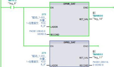 在图 6 中,采用 DPWR_DAT 和 DPR 0 变频器的写读操作。在DPWR_DAT 程序块中,将从“1#卷筒变频器”数据块DB1 接收区,其中第一个字为变频器控制字,第二个字为速度主设定值, 收到上述数据后执行相应操作。在 DPRD_DAT 数据块中,将 G120 变 ”数据块 DB1.DBX16.0 开始的8 个字中,PLC 通过对接收到的8 个 实际运行状态、速度、电流、转矩以及CU 数字输入状态值等。