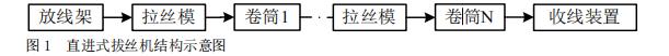 直进式拉丝机主要由放线架、多级拉丝模和卷筒、收线装置共同组成,如图1 所示。金属线材在通过第1级拉丝模后拉成更细的丝线,然后经过 1 级卷筒进入第 2 级拉丝模进行拉丝,再进入第 2 级卷筒,依次类推,完成金属线材的拉制。