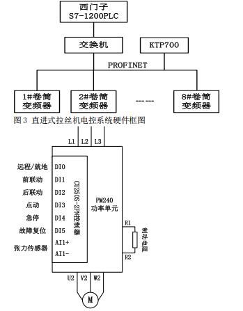 本设计直进式拔丝机电控系统硬件框图如图 3 所示:采用高性能西门子 S7-1200PLC CPU1214PLC,该 PLC具有 100Mb/s 以太网通信接口,能够胜任与底层变频器快速数据交换。卷筒变频器采用西门子 G120 变频器,该变频器数字量端口能够根据拔丝机工艺要求灵活配置,同时具有高速以太网通信端口,内置PID 工艺块等特点。触摸屏采用西门子KTP700,方便参数设置与显示。西门子PLC 与变频器的上述特点完全能够胜任拔丝机高动态响应要求。