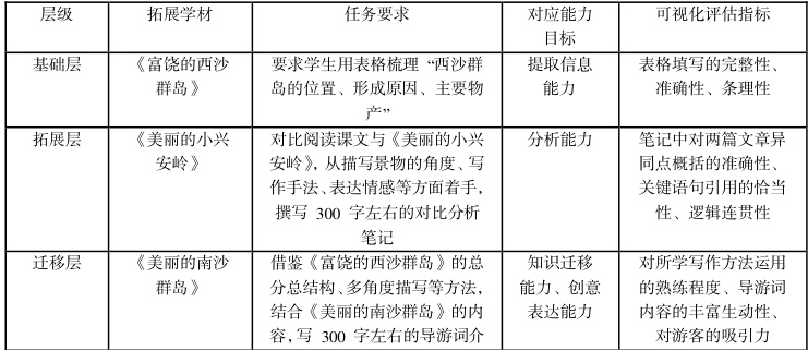 单一化的教材文本无法全面呈现能力生长的梯度。教师作为教学活动的组织者、引导者,应以文本内容为着力点,引入拓展学材,依托群文阅读资料形成“基础—拓展—迁移”的三阶内容支架,并明确各层级学材与能力目标的对应关系,让学生在处理不同学材时的表现成为能力生长的“可视化证据”。教师可据此对教学策略进行优化、调整,使学生语文能力的进阶发展具有连贯性的特征。