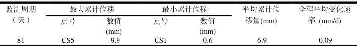 由上表的监测成果可以看出,在案例工程中CS5 号是最大累计位移点,向坑内位移-9.9mm;CS1 号是最小累计位移点;平均变化速率为-0. 09mm/d ;平均累计位移量为-6.9mm。以上数值均小于表2 设置的相应报警值。