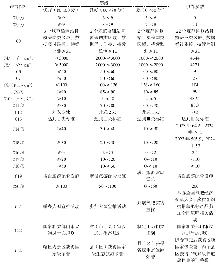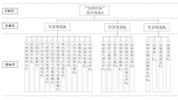 “氧吧经济”综合效益评估体系采用三级分层结构,以“目标层-准则层-指标层”为框架,将效益分解为生态、经济、社会三个子系统,并细化为23 项可量化指标[1](表1)。该体系强调科学性、系统性与可操作性,兼顾数据可得性与区域特色适配性,目前已在江西省乐安县实践中验证其科学性,综合效益评级结果与当地实际发展态势高度吻合。