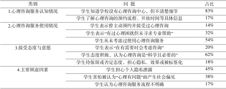 尽管如此,调查数据表明虽然大多数学生对心理健康问题持开放态度,认可心理咨询服务的价值,比如有62%的学生认为心理咨询是“科学且必要的”,但在实际使用方面仍存在较大差距,比如曾主动预约并接受过心理咨询的学生仅占 14%,有过心理困扰但未寻求专业帮助的学生占 32%,从未考虑过使用心理咨询服务的学生占 54%,调研数据综合说明学生对心理咨询服务存在认知度不够、流程不明确、隐私顾虑和社会偏见等方面的问题(表1 所示)。