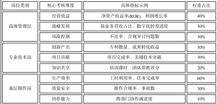 3.2 中长期激励扩容:对金融国企核心人才可试点3.2.1 超额利润分享:对超出目标利润部分按比例分成;3.2.2 项目跟投:要求技术骨干参与创新项目投资,共享收益;3.2.3 虚拟股权:模拟股权分红,避免实际股权转让障碍。酒钢集团首席技师年薪达30 万元,显著高于同级管理人员,体现技术价值认可。