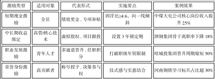 推行“固浮分离”薪酬结构,提高绩效薪酬占比(浮动部分可达60%),合理拉开收入差距(管理层差幅最高达 2 倍)。河南钢铁集团创新设立月度“三化”学习力专项工资,将数智化、绿色化等学习考核结果与薪酬晋升挂钩。中煤大屯公司对孔庄厂选矸岗位补贴1000-1200 元/月,实现“苦脏累险岗位高补偿”。