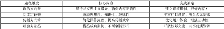 网络新媒体已成为高校意识形态斗争的前沿阵地。山东科技大学土木工程与建筑学院通过建设三个微信公众号平台,探索出高校网络意识形态阵地建设中"坚""兼""简""鉴"四个有效路径。 "即坚持正确政治方向;"兼"即兼顾思想性、知识性、趣味性;"简"即简化操作流程,提高传播效率;"鉴"即借鉴成功经验,不断创新形式。这种探索表明,高校网络意识形态建设需要坚持网络文化建设和信息安全管理两线并重,建成融思想性、知识性、趣味性、服务性于一体的校园主网站系统和新媒体矩阵。