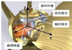 调距装置由桨叶、桨毂机构、轴系、配油器、液压系统等组成。高压油进入桨毂内伺服油缸,驱动活塞杆做直线运动,活塞杆上的滑块和曲柄销盘上的圆柱销间隙配合,带动曲柄销盘做周向转动,曲柄销盘又与桨叶叶根利用螺栓刚性联接在一起,因此,最终将活塞的直线运动转化为桨叶的转动,从而实现螺旋桨螺距的调节。如图 1 所示,通过液压系统驱动曲柄销盘和桨叶饶 Z 轴相对桨毂转动,从而调节桨叶的方位角,以此来改变推进器的推力和转矩。[1]
