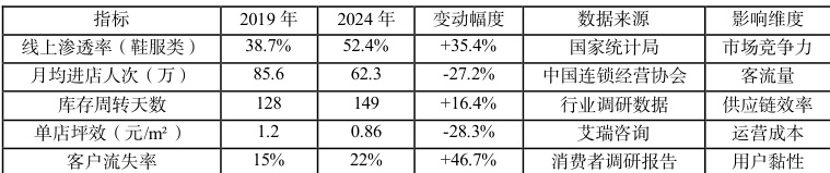 在 2016 年后,千百度遭遇多重业务瓶颈。运营层面库存周转天数从 237.8 天(2019)增至 280.3天(2022),滞销率达 28%加剧现金流压力;市场层面皮革女鞋份额从 35% (2015)缩至 18%(2022),客流量年降 9.6% ,单店坪效跌至 0.86 万元/m²;用户层面流失率升至 22% (2022),年轻客群占比从40% 滑至 25% 。转型动因包含三方面:渠道结构失衡(直营成本占营收 43% 但线上 GMV 不足 10% ),品牌固化难抵“去正装化”趋势导致溢价能力下降,战略试错消耗超 20 亿元跨界并购却无协同效应[3]。