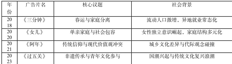 苹果广告深度绑定中国社会转型期的典型议题,通过议程设置引发公众讨论,塑造品牌社会洞察者形象。如表 1 所示,历年广告主题均与社会热点高度关联: