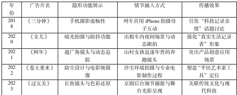 苹果公司在新春广告中采用“去工具化”叙事策略,将产品功能隐于故事情节,通过场景化应用自然传递技术优势,实现“润物细无声”的传播效果。以 2022 年《卷土重来》为例,影片讲述村民用 iPhone13Pro 拍摄自制科幻电影的故事。手机防尘功能通过“手机意外摔落沙地仍完好”的情节展现,暗光拍摄能力则借由夜间沙漠星空场景凸显。产品未以“主角”身份出现,而是作为推动叙事的工具,使观众在沉浸故事的同时感知技术价值。这一策略的关键在于“场景化植入”与“情感化绑定”[3]。品牌通过弱化商业属性,强化产品与用户生活的关联,规避了跨文化传播中常见的“硬推销”反感。表 2 梳理了苹果广告中“隐身”功能展示的具体实践: