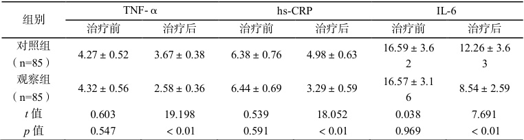 表 1 两组治疗前后炎症因子