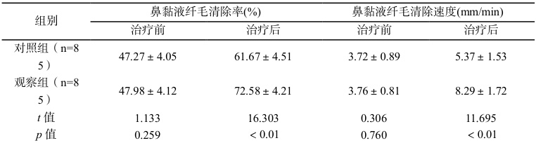 治疗后,观察组鼻粘膜功能高于对照组( P<0.05 ),见表 2 表 2 两组治疗前后鼻粘膜功能(