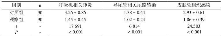 观察组呼吸机相关肺炎、导尿管相关尿路感染以及皮肤软组织感染发生率均低于对照组( P<0.0