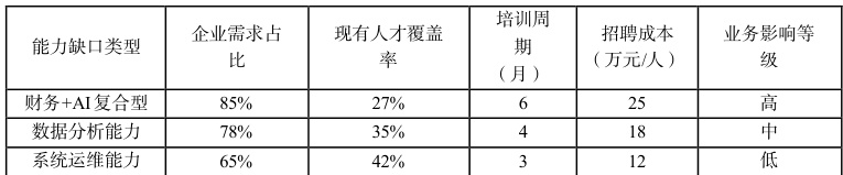 复合型人才匮乏严重制约转型进程。毕马威调研显示,73%的企业缺乏既精通财务又熟悉 AI 技术的员工,导致系统落地效果低于预期 30% 以上[3]。此外,传统财务人员技能断层明显,仅 12% 能独立完成数据建模,某零售企业因分析能力不足错失市场机会,年营收损失达 800 万元。