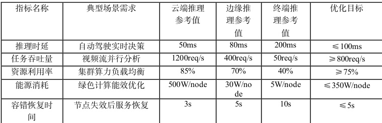 各指标间存在显著权衡关系:提升吞吐量需增加并行度,可能牺牲时延;降低能耗需减少活跃节点数,可能降低资源利用率。例如,云端集群通过弹性扩缩容可维持 85%利用率,但能耗增加 20% ;边缘节点采用轻量级模型虽降低时延至 80ms,但吞吐量受限至 400req/s。