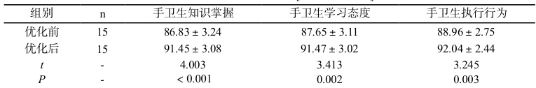 优化后手卫生知识掌握、手卫生学习态度及手卫生执行行为均高于优化前(P<0.05)。见表 1。